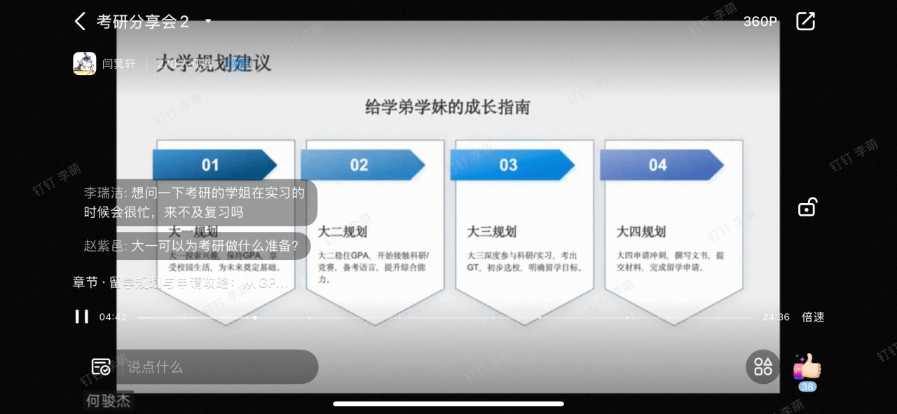 李雯静同学就考研复习科目安排、备考策略及复试要点进行了细致讲解。她分享了高效的信息搜集渠道,助力同学们降低信息获取成本,并强调了综合素质在考研中的重要作用,提醒同学们要注意在校期间科研和荣誉的积累。此外,她还为各科目提供了复习建议、推荐书目与优质网络课程资源,为学弟学妹的复习规划指明了方向。