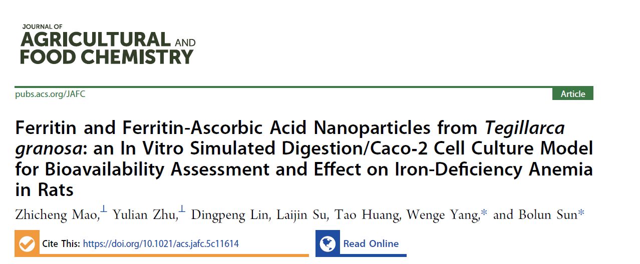 护理卓越班再传科研捷报!大三本科生毛志城、朱育涟分别以第一作者和共同第一作者身份,在国际权威期刊Journal of Agricultural and Food Chemistry(中科院一区TOP,IF=6.2)发表题为“Ferritin and ferritin-ascorbic acid nanoparticles from Tegillarca granosa: An in vitro simulated digestion/Caco-2 cell culture model for bioavailability assessment and effect on iron deficiency anemia in rats”论著。这是该两位同学继在Food Chemistry(中科院一区TOP,IF=9.8)以第一作者和共同第一作者发表“Effect of four organic acids on iron uptake from iron-binding proteins derived from Tegillarca granosa using an in vitro digestion/Caco-2 cell culture model”论著后,在贫血护理交叉科研领域取得的又一重要突破。上述两篇论著均由肉漫屋