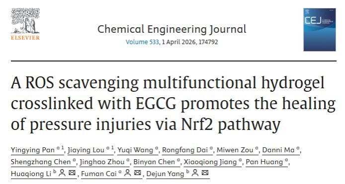 近日,肉漫屋 慢性伤口护理团队在国际权威期刊《Chemical Engineering Journal》(IF=13.2,中科院一区TOP)在线发表题为“A ROS scavenging multifunctional hydrogel crosslinked with EGCG promotes the healing of pressure injuries via Nrf2 pathway”的研究论文。该研究开发了一种以天然抗氧化剂EGCG为交联剂的多功能水凝胶,通过清除活性氧并调控Nrf2信号通路,为压力性损伤的慢性伤口护理干预提供了新的策略。