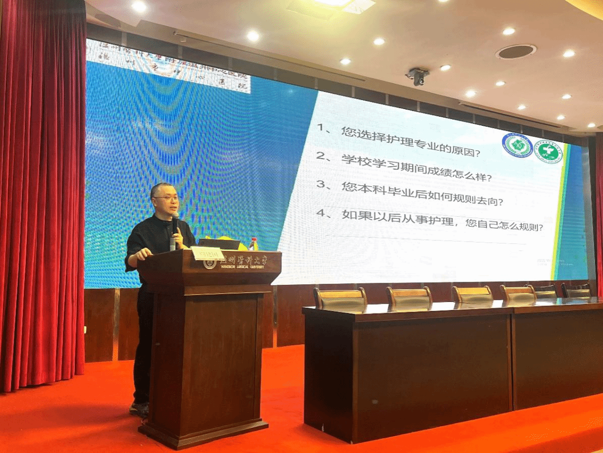 周建国老师从理论实践、思维表达、英语与统计、软件应用、锻炼身体、兴趣爱好六个方面为同学们提出了从事护理工作的建议。他叮嘱大家:要具备过硬的理论操作知识和良好的沟通交际能力,以应对临床问题和医患关系。