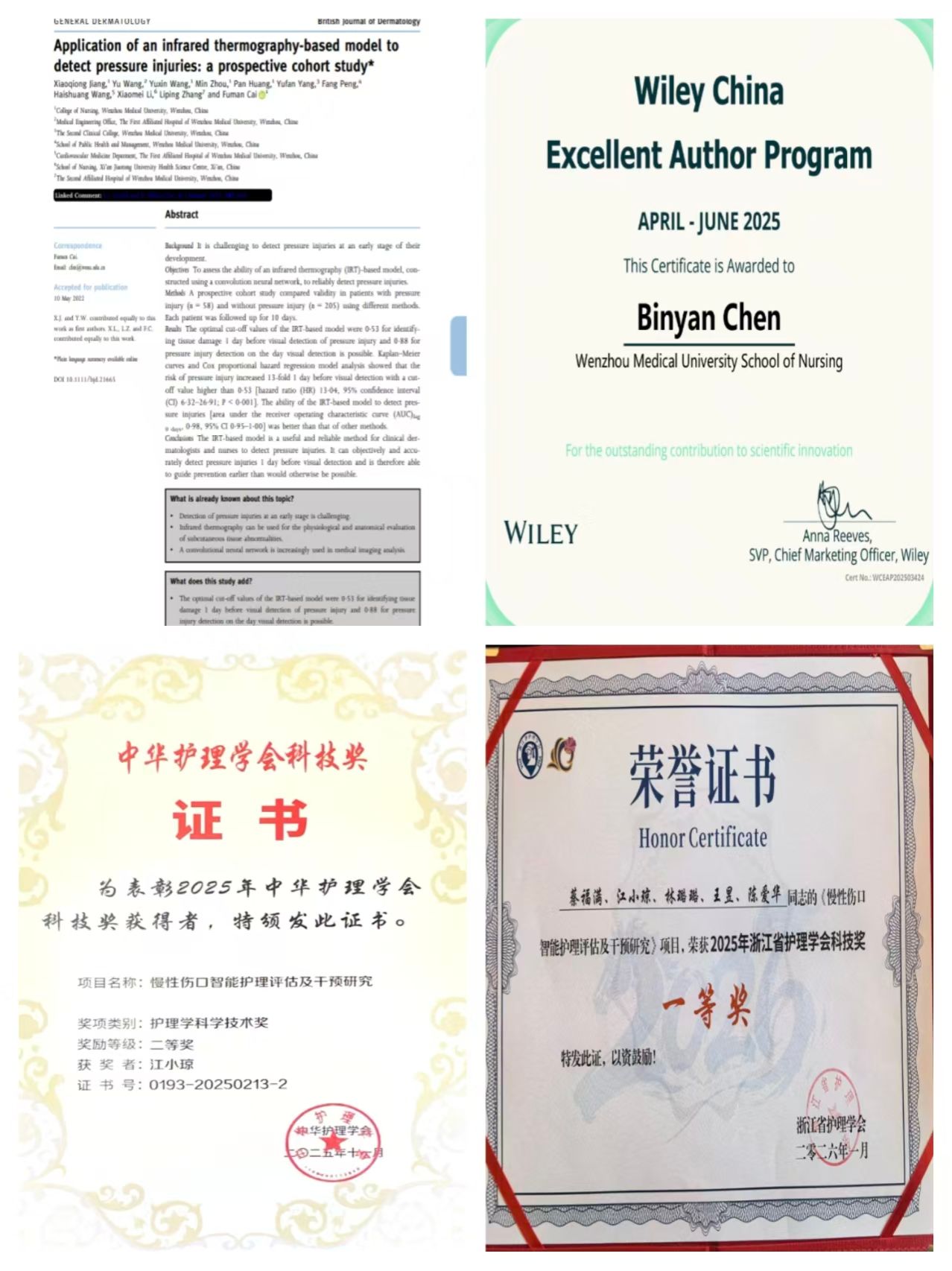 深耕教研,硕果累累。蔡福满导师潜心科研与育人,带领学生参与多项国家及省部级基金科研项目,并荣获中华护理学会科技奖二等奖、浙江省护理学会科技奖一等奖。在蔡福满及其导师团队的悉心指导下,其研究生在学术领域展现出极强的创新能力。其中,2017级硕士研究生/2023级博士研究生江小琼表现尤为突出,曾获省优秀毕业生、省优秀硕士学位论文及省专业硕士学位优秀实践成果等多项殊荣,论文入选中华护理学会百篇优秀论文,并在国际相关领域顶刊British Journal of Dermatology(TOP一区,IF=10.6)、Journal of Advanced Research(TOP一区,IF=13.0)发表高水平研究成果。近年来,学子们接续奋斗,不断刷新科研高度:2023级硕士研究生娄佳莹在Chemical Engineering Journal(TOP一区,IF=13.2)发表成果;2024级硕士研究生更是异军突起,邹米文在Alzheimer’s&Dementia(TOP一区,IF=11.1)发表论文,陈盛樟在护理学顶刊International Journal of Nursing Studies(TOP一区,IF=7.1)发表研究,陈彬艳则在Journal of Clinical Nursing(TOP一区)发表成果并荣获Wiley中国高贡献作者奖。蔡福满导师还带领学生致力于科研成果的转化应用。目前,团队已申请多项国家专利,其中一项专利成功转化30万元。令人感佩的是,他将半数收益发放给学生团队。