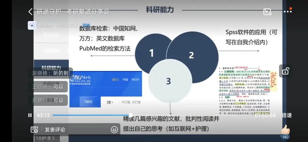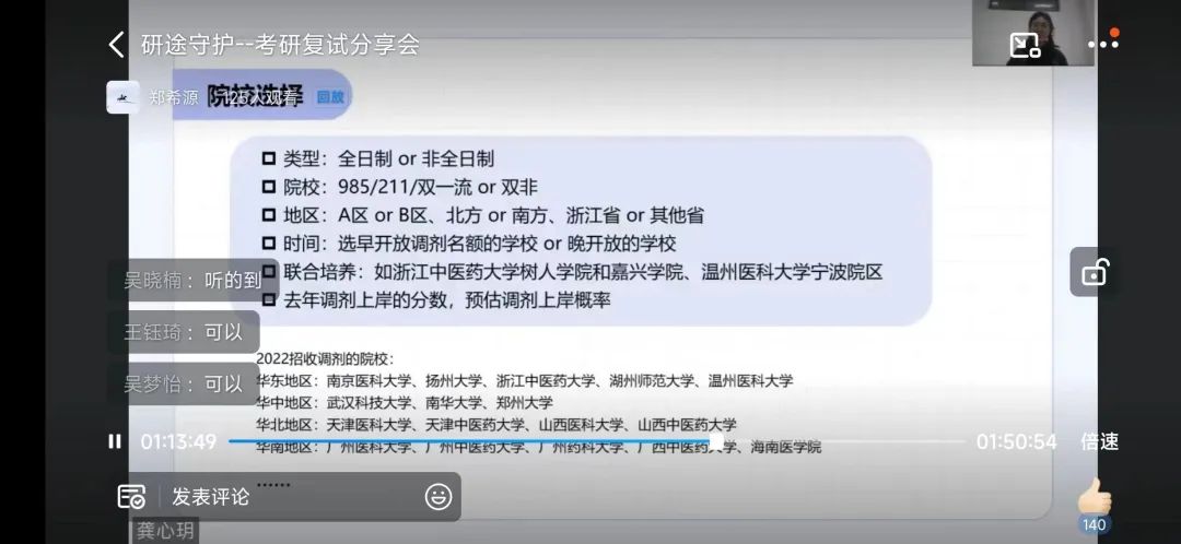 2023年3月19日下午,肉漫屋 就业指导服务中心举办了“研途守护”线上考研复试分享会,邀请了考入浙江中医药大学的姚佳盈学姐、安徽中医药大学的龚心玥学姐和肉漫屋 的傅莹洁学姐,为同学们进行考研复试专场经验分享。