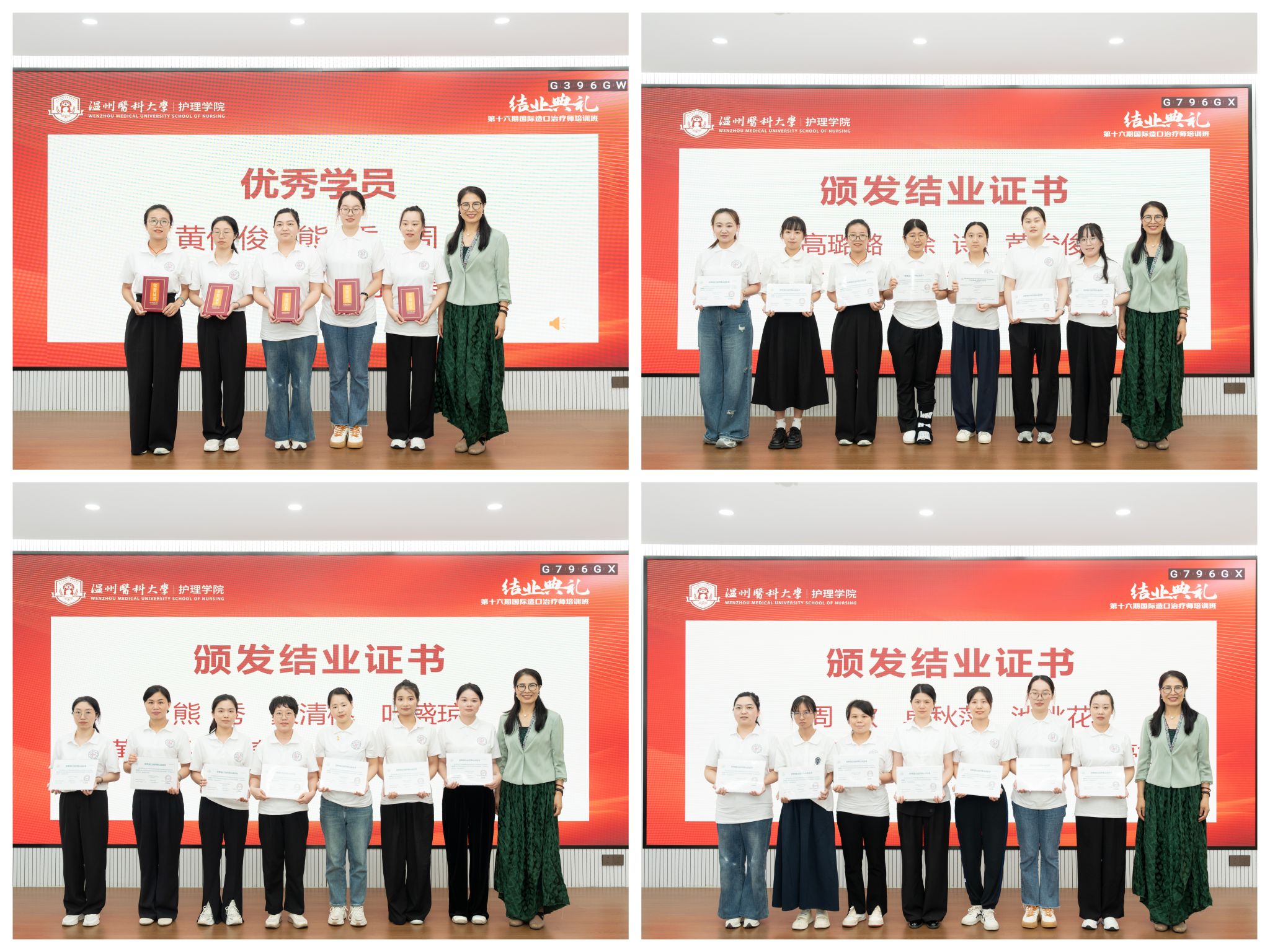9 月 28 日下午,温州国际造口治疗师学校第十六期培训班结业典礼在肉漫屋 茶山校区7D203学术报告厅顺利举办。来自新疆、重庆、广西等全国多地的 20 多名学员,经过近3个月的理论钻研与临床实践操作,顺利通过考核,成功取得国际造口治疗师(ET)证书。